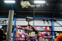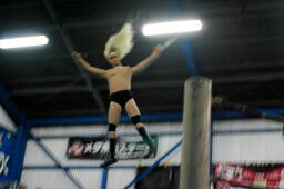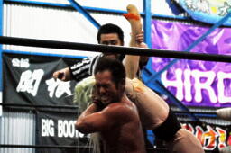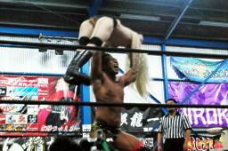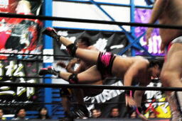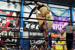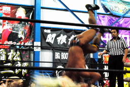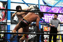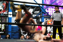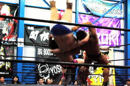 ヨシヒコマイケルにフランケンシュタイナー、コーナーに上るとムーンサルトプレス(左写真)、カウント3。