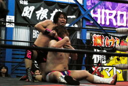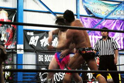 先発はヨシヒコと石井。ヨシヒコヘッドロックからフライングメイヤー、石井ヘッドシザーズ。石井弓矢固め、ヨシヒコ切り返してカバー、カウント1。石井上になってエルボー連打(右写真)、