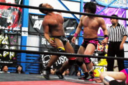 ディーノロープエスケープ、石井はマイケルにタッチ。マイケルディーノにエルボー(左写真)、ロープに振ってバックエルボー、カウント2。さらに逆水平連打、石井にタッチ。