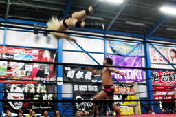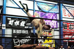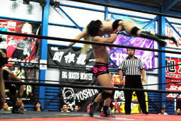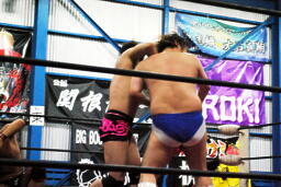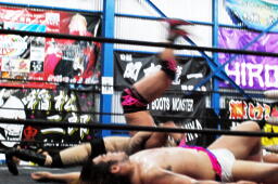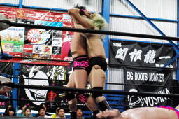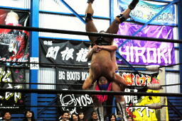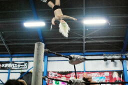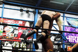 ディーノが石井をリングに戻してヨシヒコがコーナーからダイブ(右写真)、