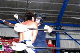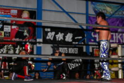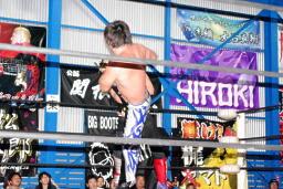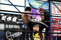 HARASHIMAローキック連打(左写真)、HERO!はあまり集中していない。