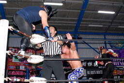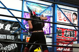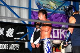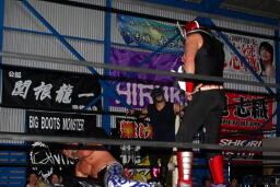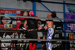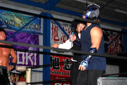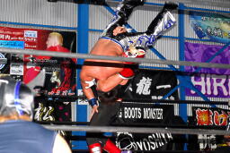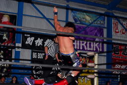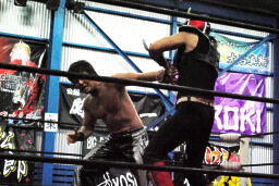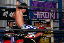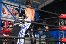 ダークサイドがコーナーに上る、松井レフェリーが制止に行くとHERO!はその背後からHARASHIMAをぶつける(右写真)