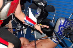頭をエプロンに叩きつける(左写真)。5分経過。
