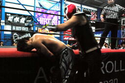 ファルコンアロー(右写真)、カウント2。10分経過。