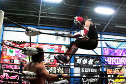 HERO!コーナーパンチ連打、首投げからドロップキック(右写真)、カウント2。