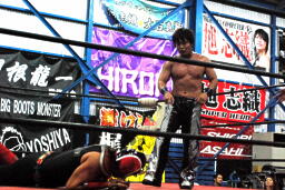 回復したHERO!はHARASHIMAをコーナーに振って串刺しエルボー(右写真)、