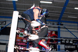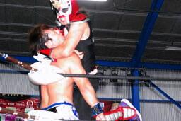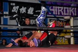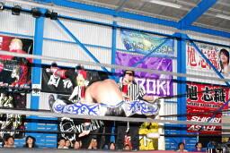 さすがに暗いのでここからはフラッシュ使用。HARASHIMA雪崩式ブレーンバスター(右写真)、カウント2。