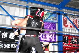 HERO!ストレッチからサミング(左写真)。コーナーのHARASHIMAに串刺しドロップキック、ロープから顔を出すとエプロンに出てまたドロップキック。