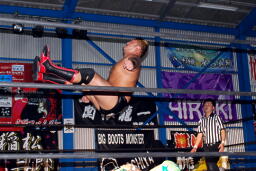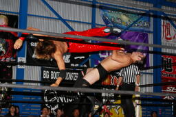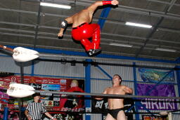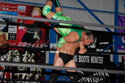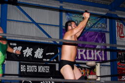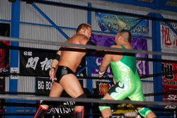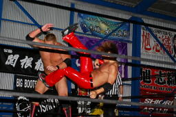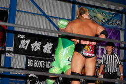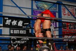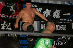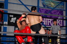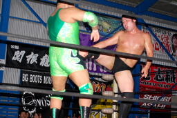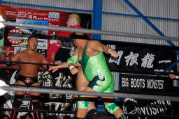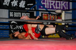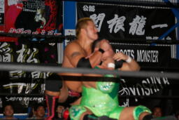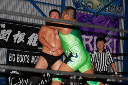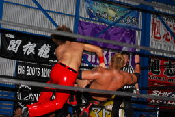 火野逆水平2発、関根にタッチ。関根首投げからサッカーボールキック(右写真)。ストンピングからチンロック、リリースしてニードロップ、火野にタッチ。