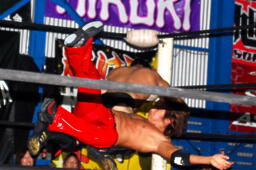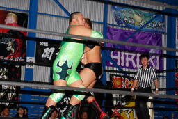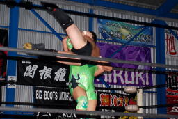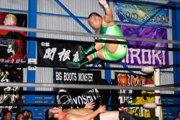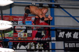 コーナーに上ってミサイルキック(右写真)。スイングDDTは関根ブロック、胸板に蹴り入れて火野にタッチ。