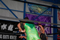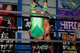 「FUCK YOU!」セントーン(左写真)、高尾カット。火野は関根にタッチ。関根突っ込む、入江パワースラム、高尾にタッチ。