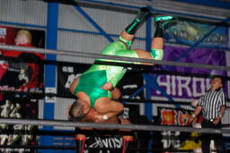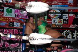 高尾Fuckin'ボムをウラカン・ラナに切り返す(右写真)。しかし関根がキックでカット。