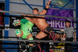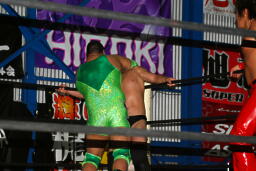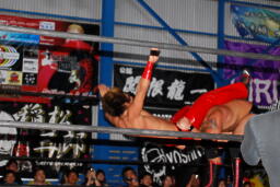 関根ロープに飛ぶ、入江ブラックホールスラム(右写真)、高尾にタッチ。