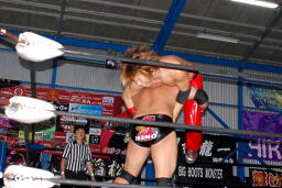 入江ガットショット、ヘッドロック。火野ロープに振る、ショルダーブロックの打ち合い(右写真)。