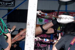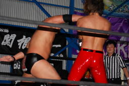 関根も張り切ってカンチョー狙うが(右写真)入江はすでに自由になっており関根の顔面にエルボー。入江は高尾にタッチしようとするが火野が阻止。5分経過。