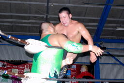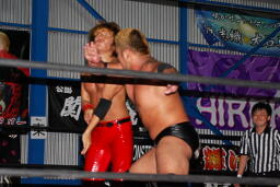関根またボディスラム狙うが入江は関根にエルボー(右写真)。エルボーの打ち合いから関根ソバット、コーナーに連れ帰る。