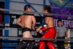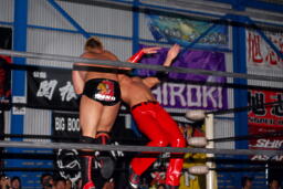 先発は高尾と関根。ロックアップ、高尾バック取る、関根切り返す、高尾腕をひねる。関根切り返してハンマーロック、高尾切り返す。関根ヘッドロックに、高尾ロープに振る、関根ショルダーブロック(右写真)。