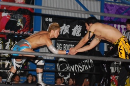 大石腕を取ってハンマーロック、KUDO切り返す、大石はロープをくぐることで切り返す(右写真)。テイオー流?