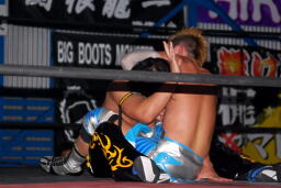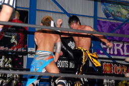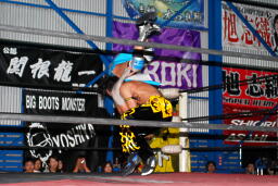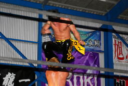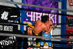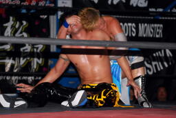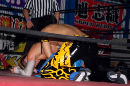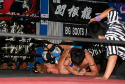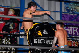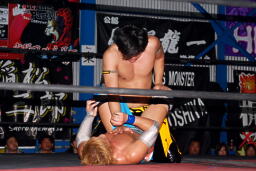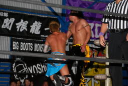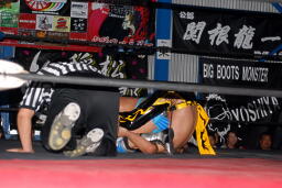 大石エルボー、KUDOミドルキックの打ち合いからKUDOは肩に担いで垂直に落とす(左写真)、カウント2。