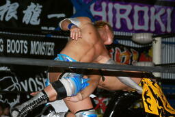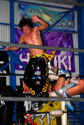 KUDOコーナーに上る、大石起き上がって追いかける、KUDOは大石を逆さ吊り状態にしてダブルニードロップに行くが大石かわす(右写真)。