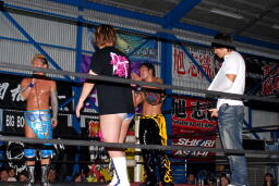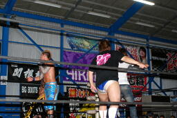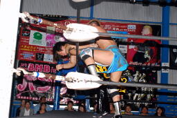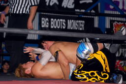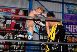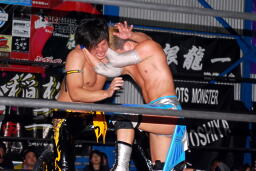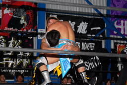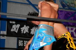 ロックアップ、KUDOロープに押し込む、ブレーク。大石ガットショットからヘッドロック、フライングメイヤー、KUDOヘッドシザーズ。大石再度ヘッドロック、KUDOロープに振る、大石ショルダーブロック(左写真)。大石フライングメイヤー、KUDOロープに振ろうとするが大石は振らせない。5分経過。
