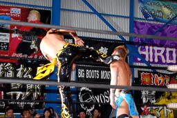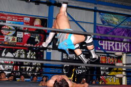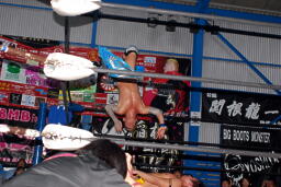 KUDOコーナーに上ってダイビングダブルニーアタック(右写真)、カウント2。