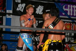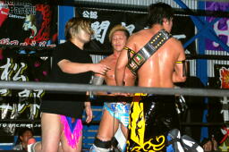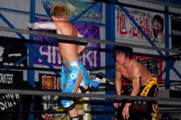 大石ロープに飛ぶ、KUDOミドルキック。KUDOロープに飛ぶ、大石ネックブリーカードロップ。大石ヘッドロックからブルドッグ、カウント2。チキンウィングフェースロック(左写真)、KUDOロープ。