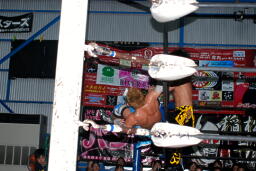 エプロンからのドロップキックからコーナーに上って絶品(右写真)、カウント2。