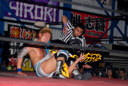 再びサイドヘッドロック(左写真)からハンマーロック、KUDOそのまま持ち上げてボディスラム、大石放さない、KUDOロープ。