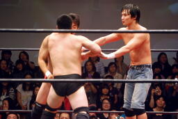 関根が入ってくるとトウナイはワキ固め、彰人はアンクルホールドの共闘(左写真)。関根ロープ。
