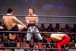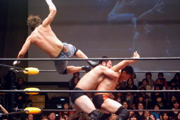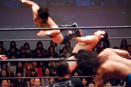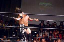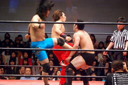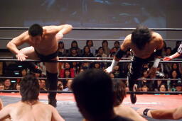 トウナイ入って関根をダブルでロープに振りダブルのチョップ。続いて杉浦をダブルでロープに振る、杉浦はクローズラインかわして2人にドロップキック(右写真)。
