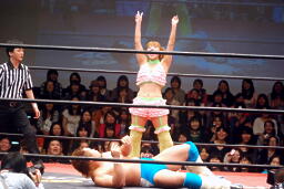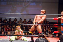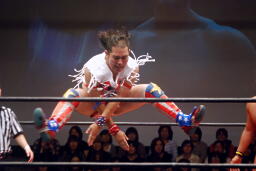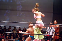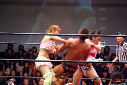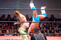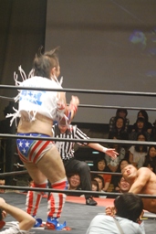 チェリーがコーナーからダイブ、松永下からボディにパンチ(右写真)、マイケルにタッチ。