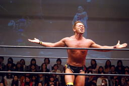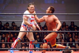 マイケルは首投げから「サッカーボールキックー!」(左写真)