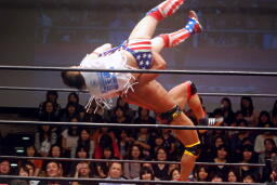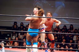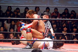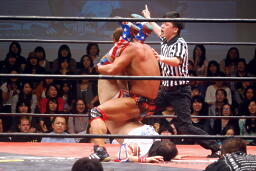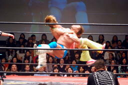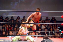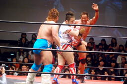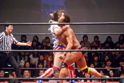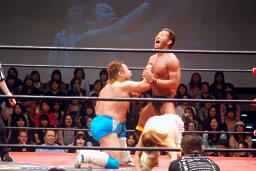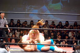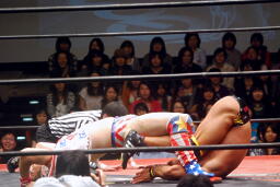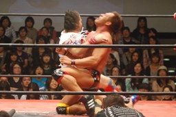 バックの取り合いからばってんはヨーロピアンクラッチ(左写真)、カウント2。首固め、カウント2。5分経過。