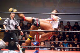 飛び降りて(右写真)、ボディプレス、カウント2。