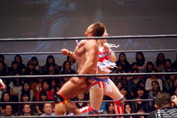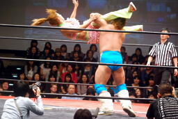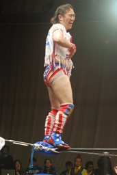 ばってんがボディスラム、ストンピングからコーナーに上る(左写真)、