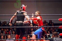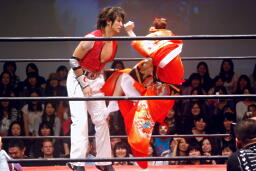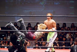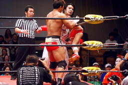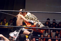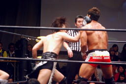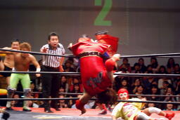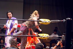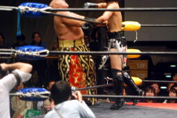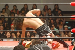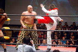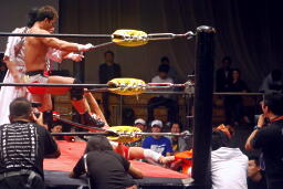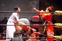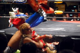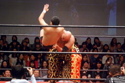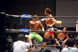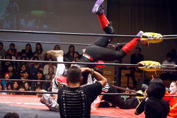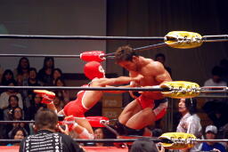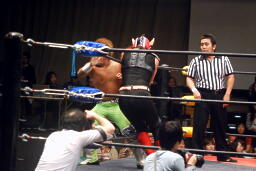 星誕期張り手で反撃、ロープに詰まった鳥羽に突っ込むが鳥羽かわして(右写真)星誕期はエプロンに。