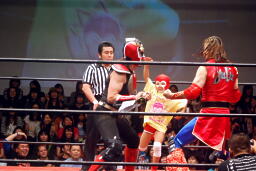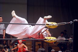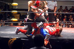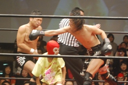 BENTENコーナーに突っ込む、HERO!かわしてスクールボーイ、堂々と足をロープに掛けてフォール(左写真)、さすがに発覚し無効に。