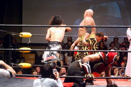 BENTENと諸橋がミスター6号を落とそうとする(左写真)、