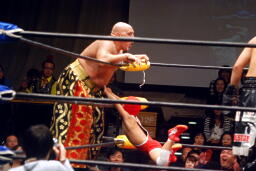 10番目ビッグ諸橋、5分経過、残り試合時間5分。諸橋は翔太をトップロープ越しにエプロンに(右写真)、