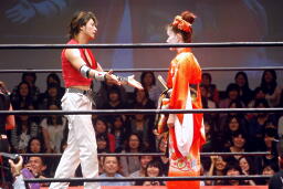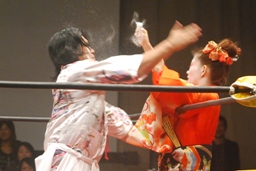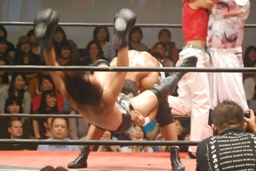 しかしMIYAKOは容赦なく急所蹴り(右写真)、諸橋がカバー、カウント3。