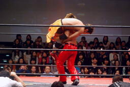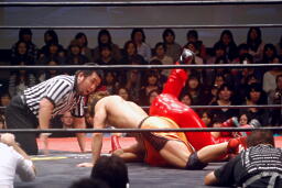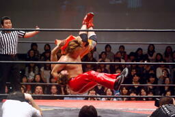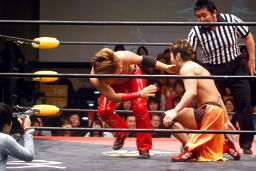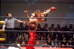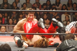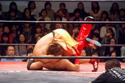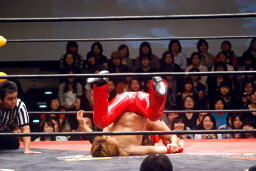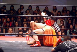 高梨トルネードクラッチ風のエビ固め(右写真)、カウント2。