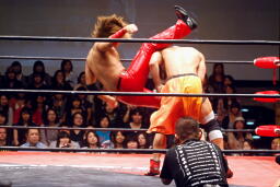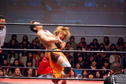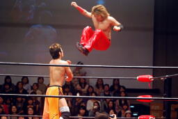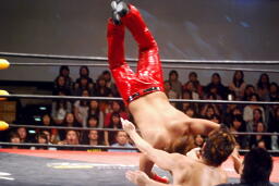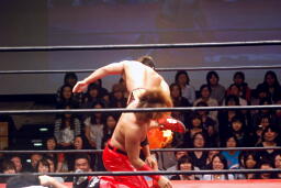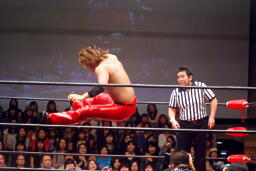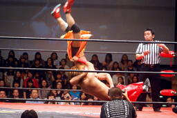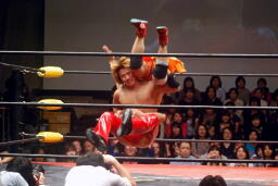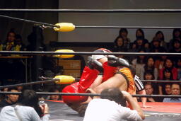 高尾コーナーに上ってダイビングギロチンドロップ(右写真)。