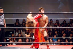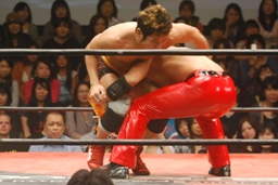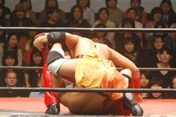 高尾潰してエビ固め(左写真)、カウント2。