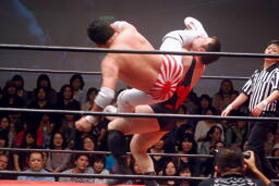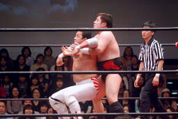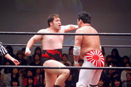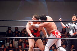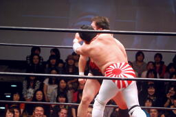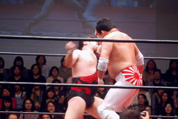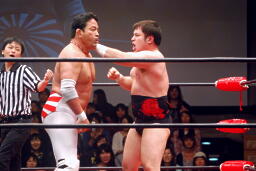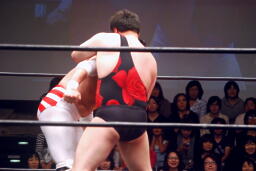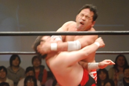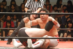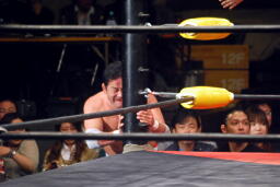 火の玉ボム(左写真)、菊地一旦立ち上がってリングを一周してからカバー、カウント2。何だったんだ?