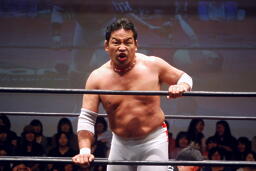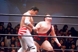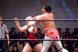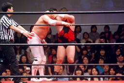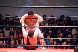 菊地エプロンに出る、アントン捕まえてトップロープにノドを叩きつける(左写真)。