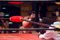 場外に飛び降りざまに顔面をエプロンに(左写真)。