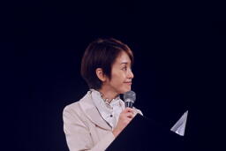 三田さん笑顔で亜門さんの話を聞く(右写真)。