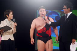 彰人からアイウエオ順にヨシヒコまで(左写真)48人中41人が北側ひな壇に座る。大家拳號、菊地毅、ケニー・オメガ、ゴージャス松野、タノムサク鳥羽、ミスター6号、矢郷良明の7人は「所用のため欠席」。ケニーは昨日の調印式までで帰国したのかな?