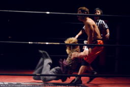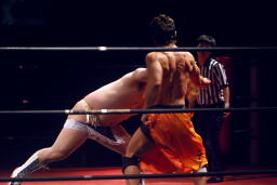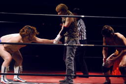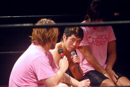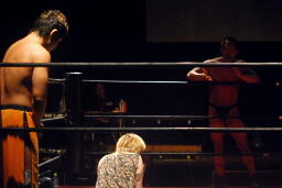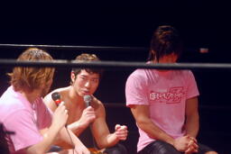 そこでディーノ、高梨、ニラが真剣に3wayやって、マイケルが誰か笑わせることができたらマイケルの勝ちで爆笑王防衛、笑わせられなかったらマイケル負けということで試合に。マイケルはどのタイミングで出てきてもいいということで一旦控室に。マイケル「こんなことでギャラもらっていいのかな。おっかねえな。ギャラだけに。おっかね。」